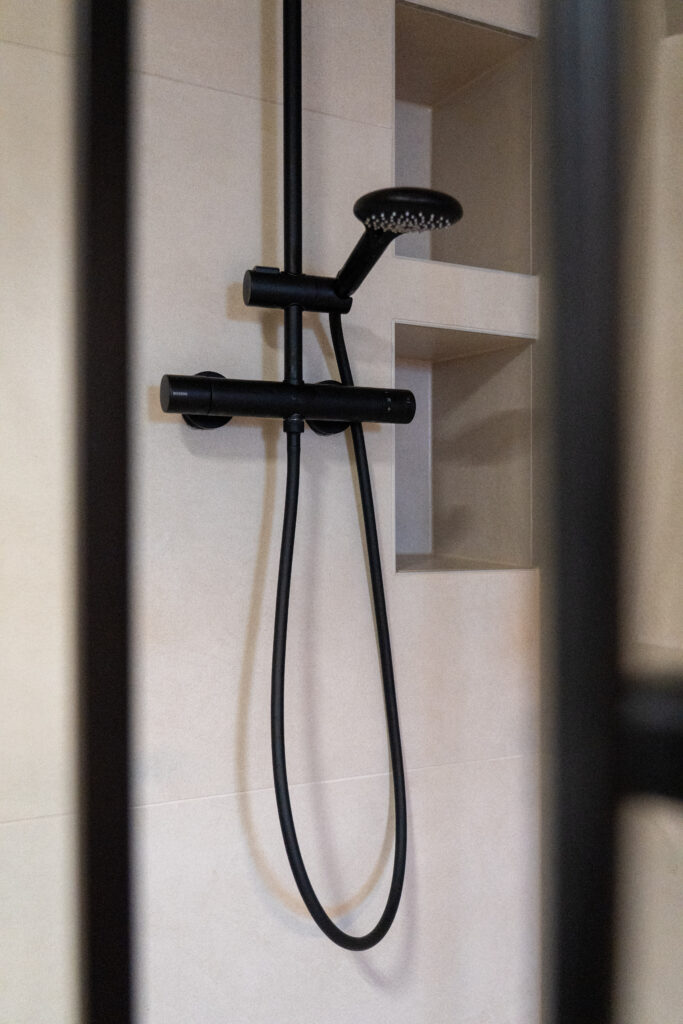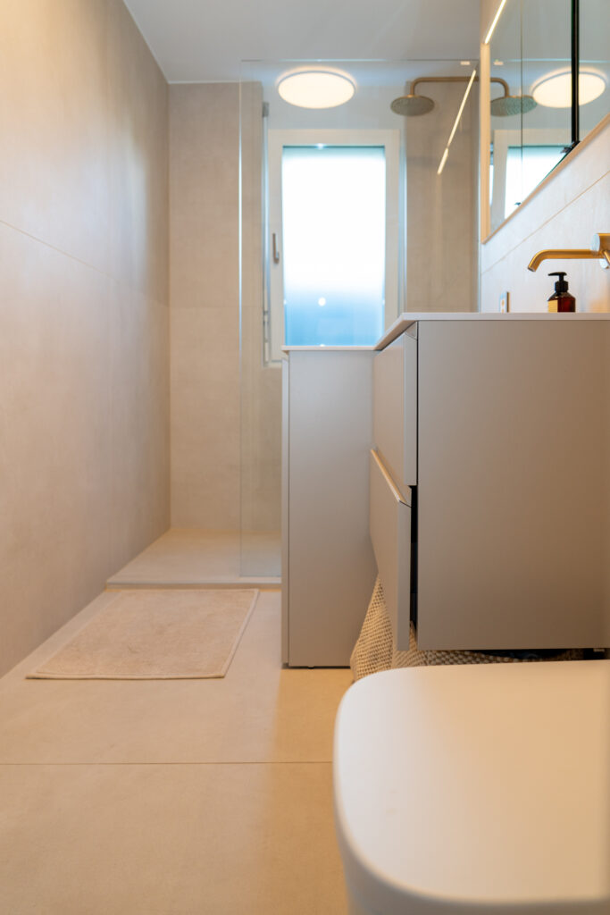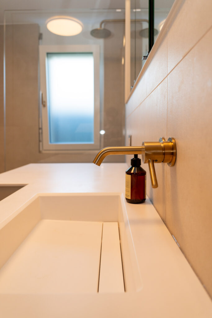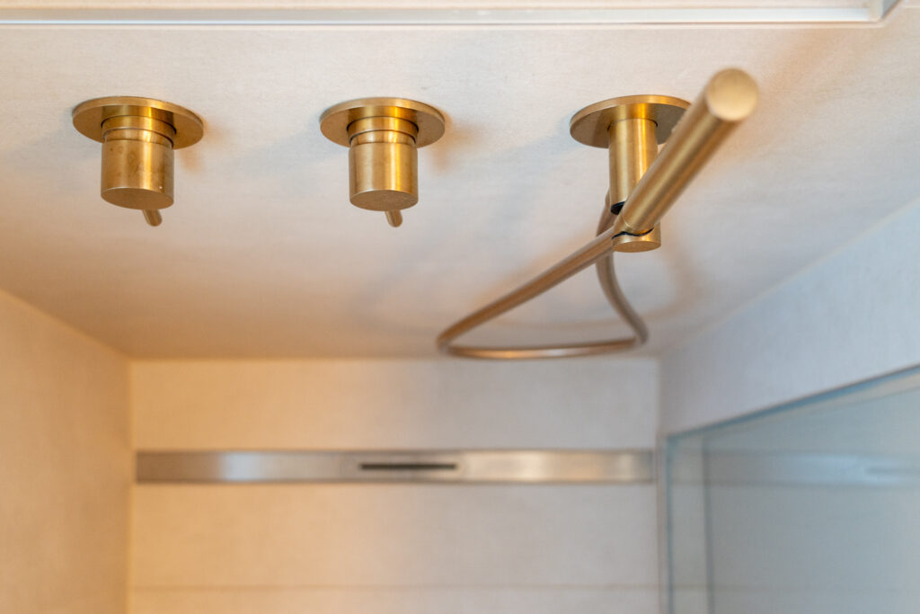 Prestations premium: carrelage grand format, robinetterie finition or avec corps encastré, éclairages soignés et rangements sur mesure.