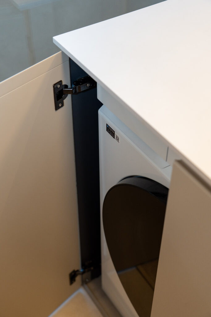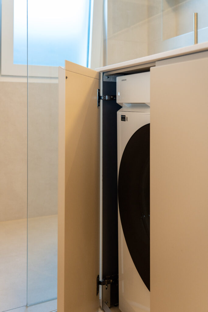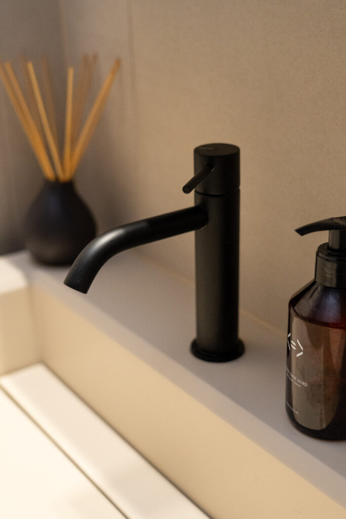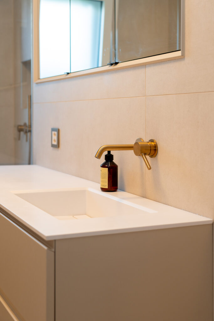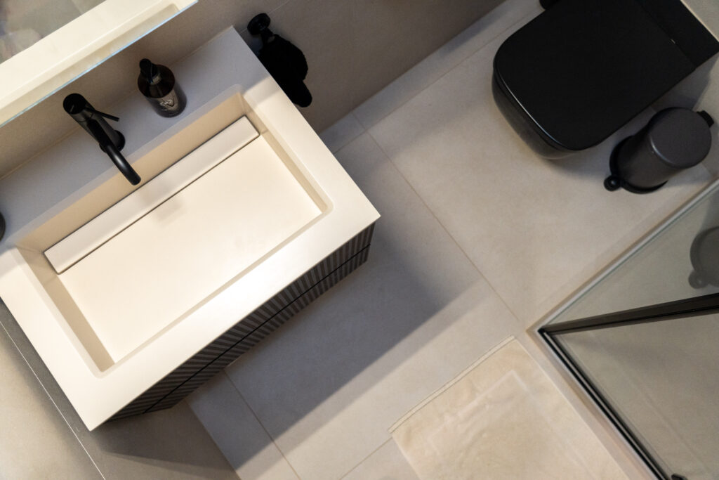 Prestations premium: carrelage grand format, robinetterie finition or avec corps encastré, éclairages soignés et rangements sur mesure.